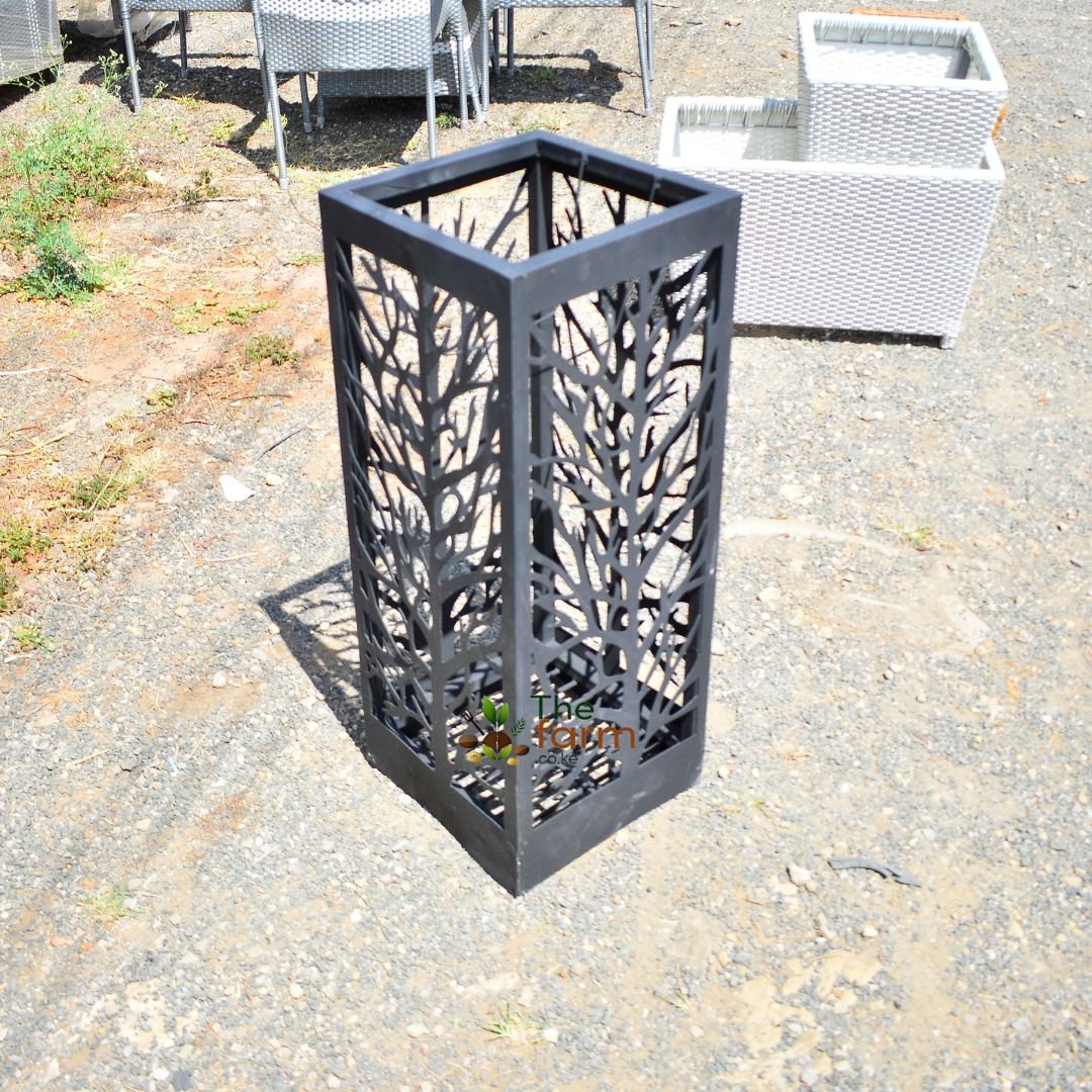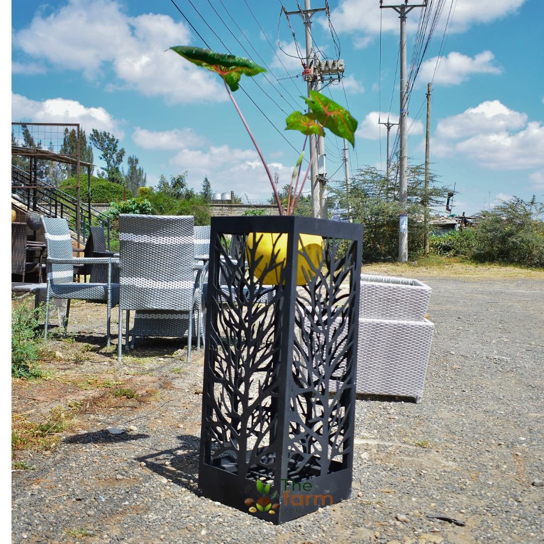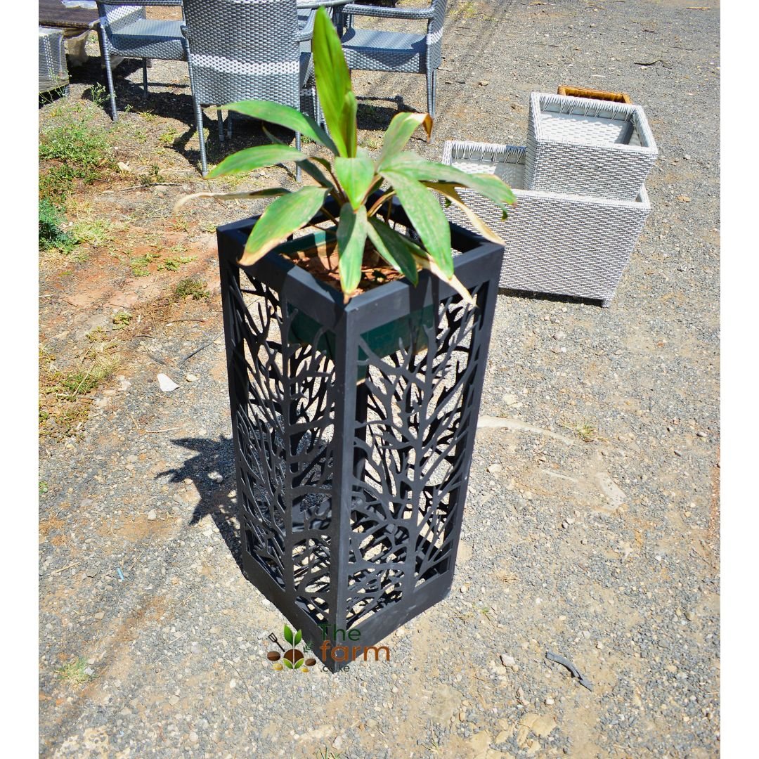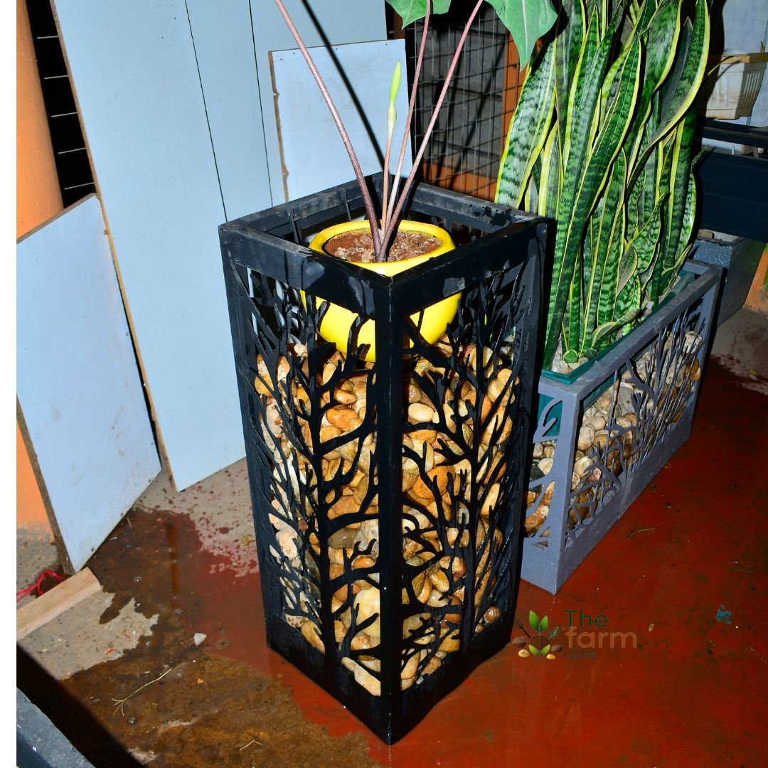 The CNC Planter 005 is a tall, slim planter designed for narrow spaces that require vertical emphasis. Measuring 35cm by 35cm by 90cm, it is ideal for corridors, walkways, balconies, and modern landscaping layouts. This planter is engineered to cover existing plastic, clay, or fiberglass planters that often degrade over time and lose their aesthetic appeal. Instead of repainting or replacing damaged pots, this CNC planter gives them a completely new life with a refined design. These metallic CNC planters are uniquely designed and produced by thefarm.co.ke, making them one of their trademark offerings in Kenya. Custom CNC or concrete planters can be developed in various shapes, sizes, and patterns depending on your space, with site visits available for larger projects.