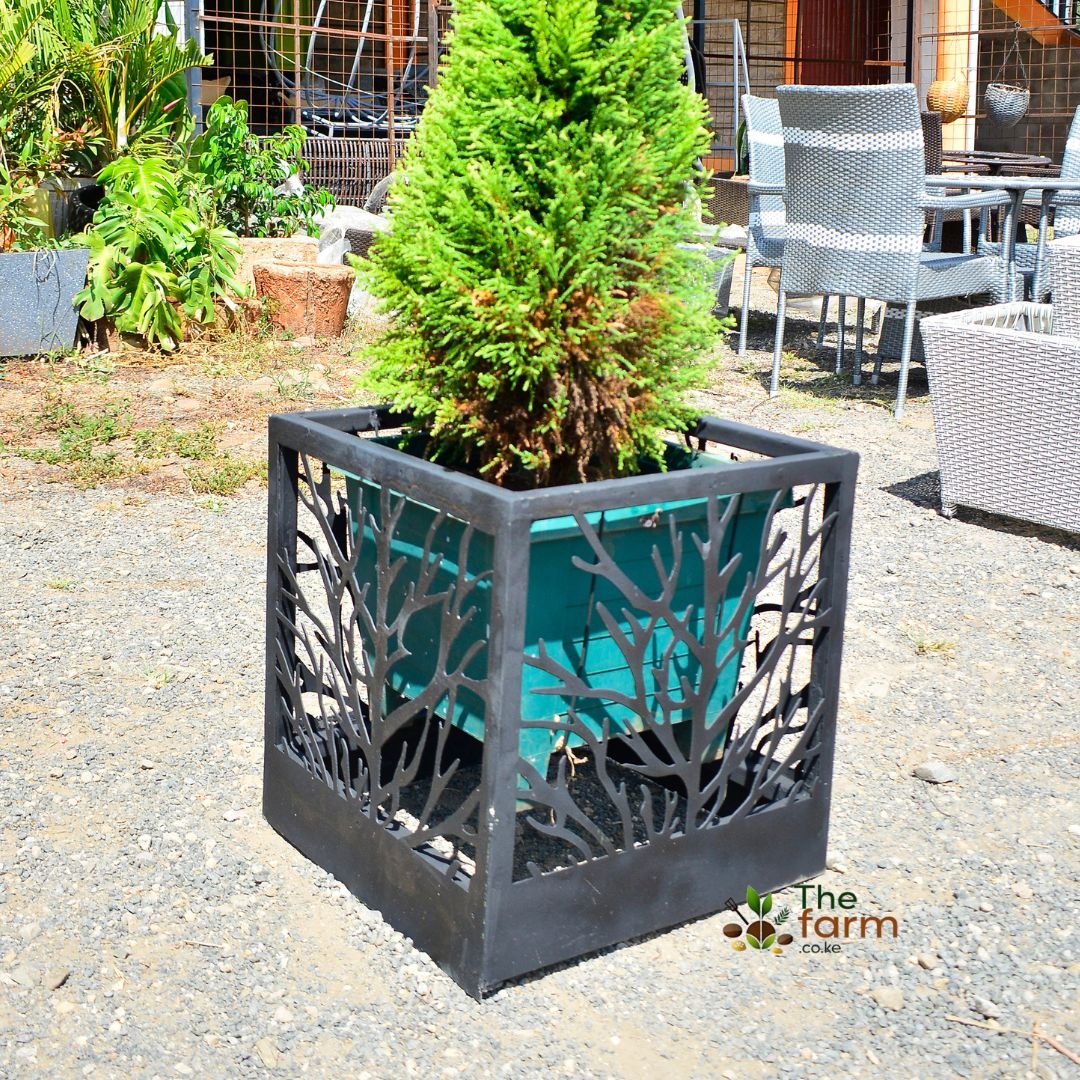 The Metalic CNC Planter 003 is designed for those seeking height and presence in their planter design. Measuring 48cm by 48cm by 53cm, this planter works exceptionally well in entrances, corridors, balconies, and landscaped interiors. It is specifically created to accommodate both square and round planters while concealing deteriorated plastic, clay, or fiberglass pots that often suffer from discoloration and surface damage. These CNC metallic planters are uniquely crafted by thefarm.co.ke, making them unavailable anywhere else in Kenya. Whether used indoors or outdoors, they bring a timeless, sculptural appeal to any space. Thefarm.co.ke also offers fully customized planter solutions in CNC metal or concrete, with unique patterns, sizes, and shapes tailored to your project. For large developments, site consultations are available.